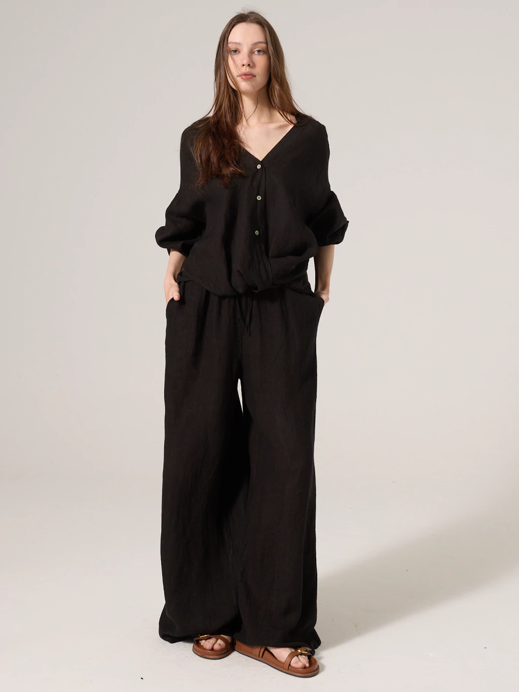 Pantalón ancho con elástico en la cintura y lazos a tono para ajustar, fabricado en Italia, confeccionado en 100% lino, con un acabado impecable. Diseño clásico, canchero y de la mejor calidad.